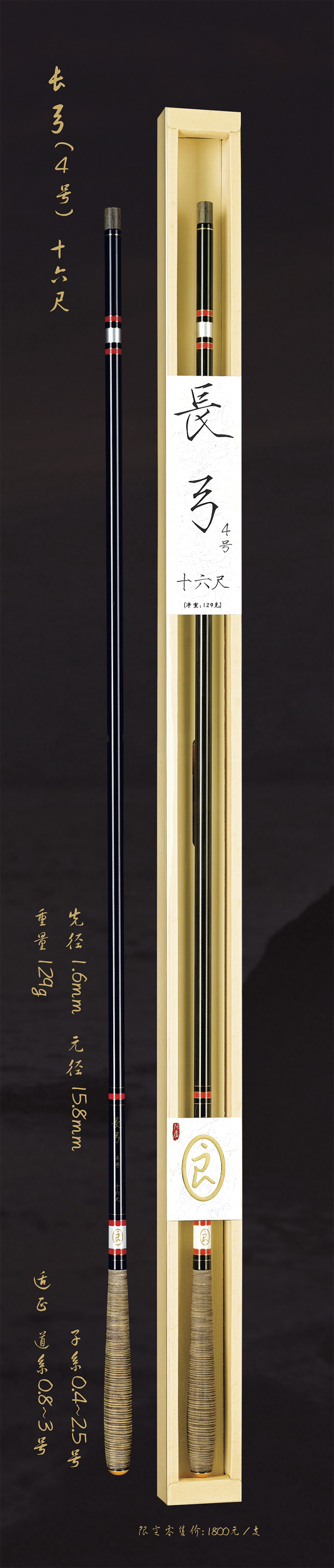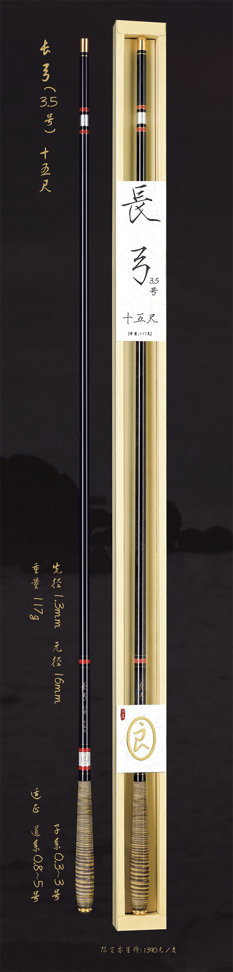 深圳市一良致釣有限公司經(jīng)過專業(yè)研發(fā),反復(fù)調(diào)試現(xiàn)推出長弓3.5號十五尺,長弓3.5號十八尺,長弓4號十六尺三款新品釣竿。